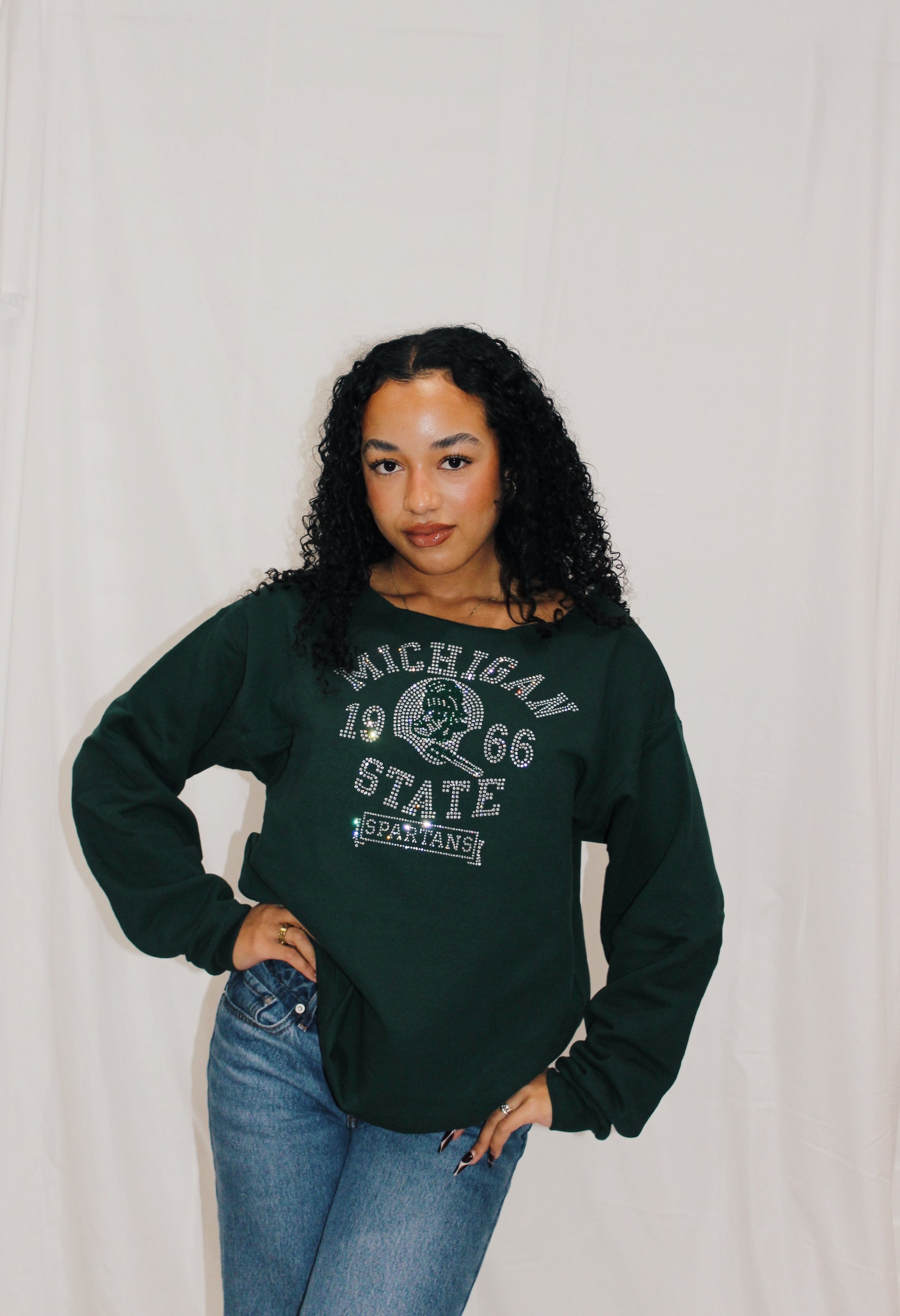Rep your Michigan State pride with our Spartan Crew! This green off-the-shoulder crewneck features a cool, vintage-inspired design that’s both timeless and trendy. Perfect for game days, tailgates, or lounging in style, it’s a must-have for every Spartan fan.