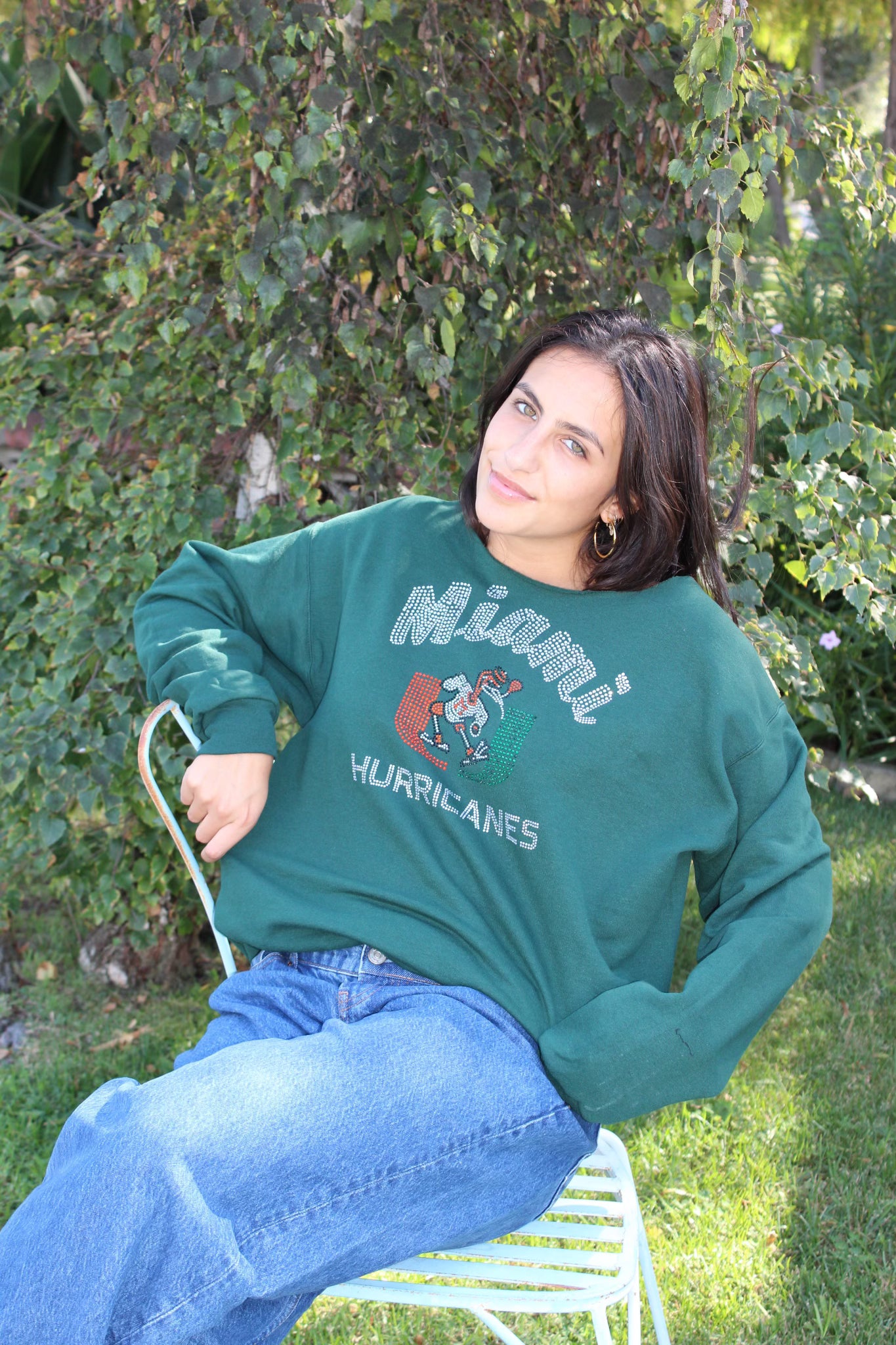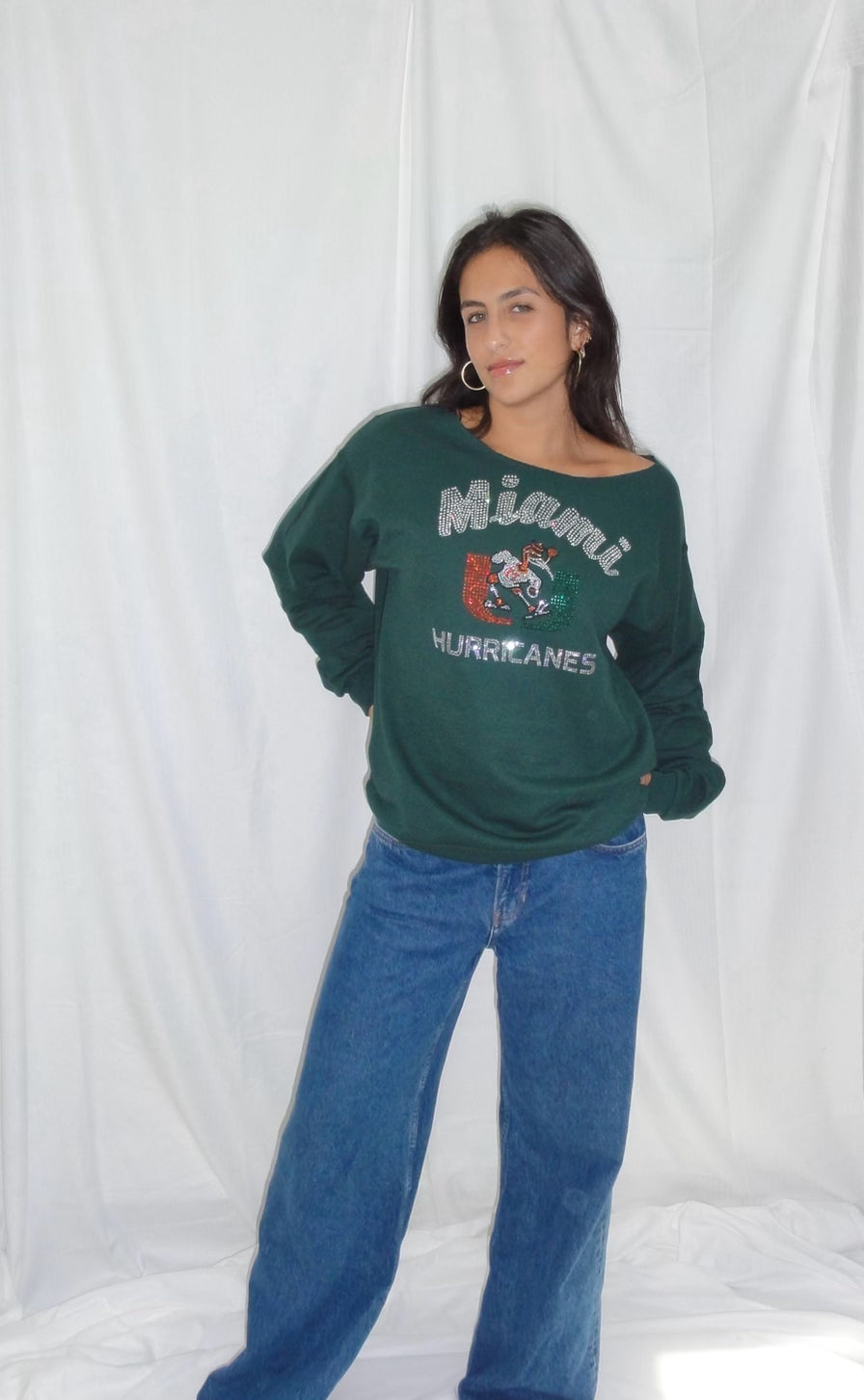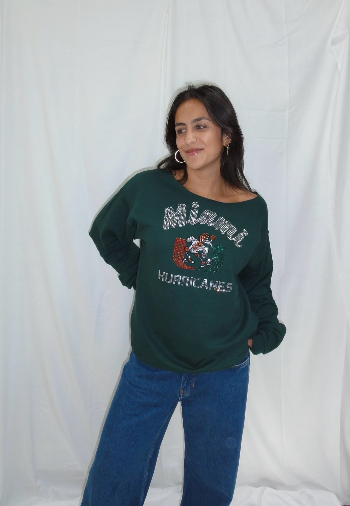 Stay cozy and cute with the UMiami Crew! This green, off-the-shoulder sweatshirt features a cool graphic that’s perfect for showing off your Miami spirit. Super comfy and stylish, it’s ideal for lounging around or cheering on the Hurricanes in ultimate comfort.